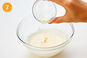 ゼラチンが熱いうちにゼラチンを(4)のボウルに入れ、よくかき混ぜる。