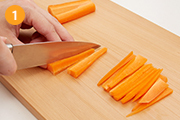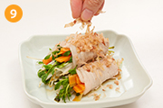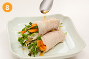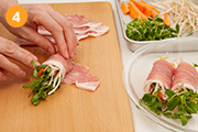 豚肉を1枚ずつひろげ、(1)~(3)の野菜をそれぞれ適量のせて巻く。