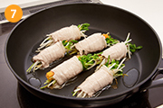フライパンに(4)の肉巻き野菜を並べいれたら、調味料Aの1/3量を入れてフタをする。