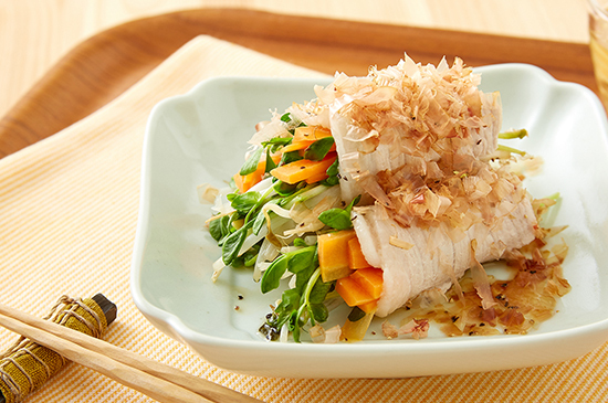油不使用!たっぷりの野菜でボリューム大な1品!豚肉と鰹節のうまみ、そして酢のほどよい酸味でさっぱりと食べられます☆