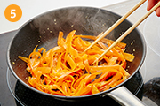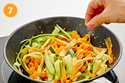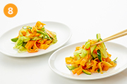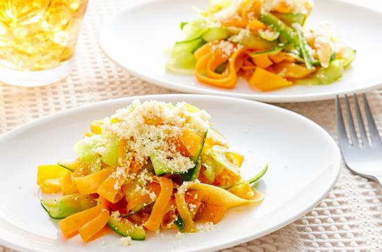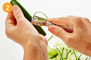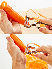 にんじんは皮をむいた後、ピーラー(皮むき器)でリボン状にスライスする。