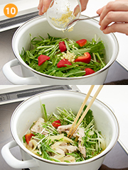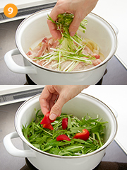 水菜とパプリカにはあまり火を通さず歯ごたえを残し、良く噛んで食べましょう!お好みでえのきだけなど入れても美味しい☆