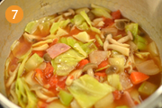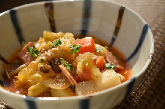 寒〜い冬に身体の芯から温まる野菜がたっぷり入ったトマトベースのスープは低カロリーで食物繊維がしっかり摂れるヘルシーで腹持ち抜群の一品です。