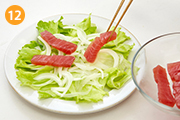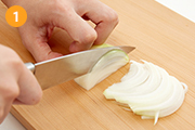 玉ねぎは繊維に沿って薄くスライスしたら、5分ほど水にさらして、水気を切る。