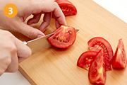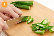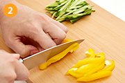 きゅうりは千切り、黄パプリカは縦に3mm幅の細切りにする。