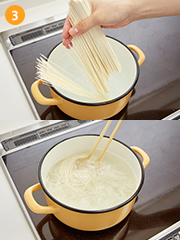 そうめんを、記載のゆで時間の半分の時間ゆでる。(例:ゆで時間2分なら1分ゆでる)