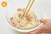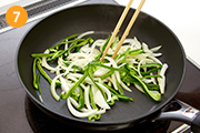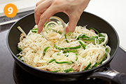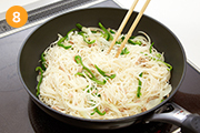 野菜に火が通ったら、そうめんを加えてさっと炒め、鶏がらスープと塩こしょうで味を調える。