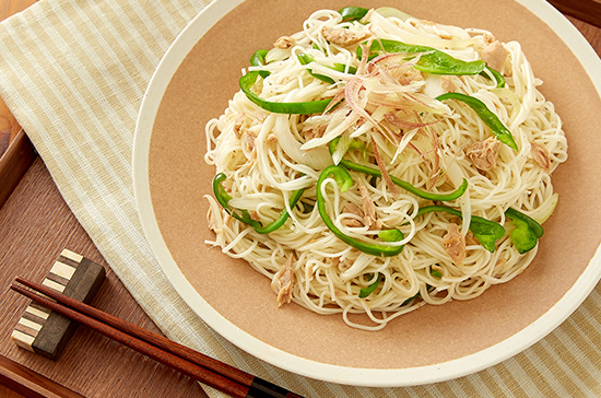 そうめんはゆでた後に炒めるため、ゆで時間は半分でOK。きのこやゴーヤ、なす、ズッキーニなど他の野菜でも合います。