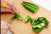 茹でたオクラを乱切りにする。