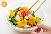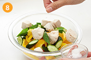 ボウルに(3)・(4)・(7)・塩を入れて混ぜ合わせる。