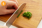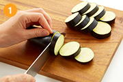 なすのヘタを切りおとし、16枚(1cm幅)の輪切りにする。