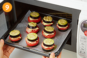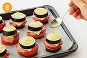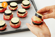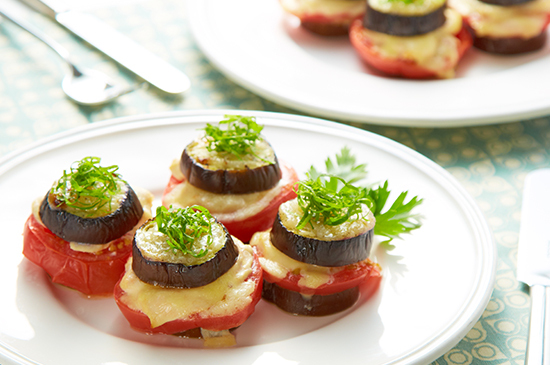 チーズは最後にのせてもOK!なすとトマトの大きさを合わせるときれいです。