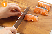 鮭は半分に切る。厚みがあれば厚さが半分になるように切り、塩をふっておく。
