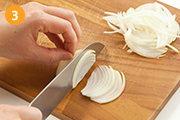 玉ねぎは繊維に沿って薄くスライスする。