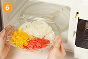 耐熱皿に玉ねぎ・ピーマン・合せ調味料を入れて、ふんわりラップをしたら、500Wの電子レンジで2分加熱する。