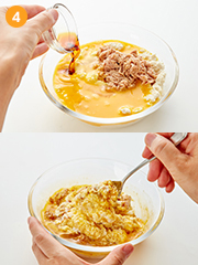 (3)に溶きほぐした卵とツナ、出汁割り醤油を入れたらよく混ぜる。