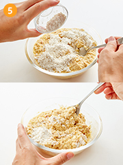 (4)に薄力粉を入れ、全体に均一になるまで混ぜる。