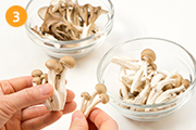 しめじ、まいたけは石づき切り落として手でほぐす。