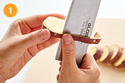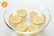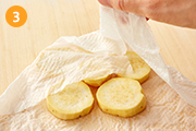 さつまいもは1cm幅の輪切りにし、皮をむく。