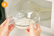 (3)を耐熱皿にのせたらラップをして、500Wの電子レンジで3分加熱する。