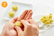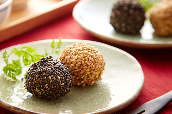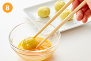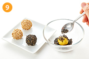 (8)の2つに、小さじ1ずつの白ごまを転がしながらまんべんなくつける。