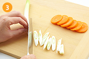 にんじんは薄切りに、長ねぎは斜め切りにする。
