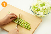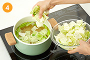 キャベツ・アスパラを加え、1分ほど一緒にゆでたら、ザルにあげておく。