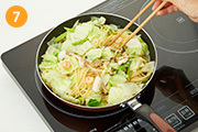 フライパンに、キャベツ・アスパラ・スパゲティを合わせ、ゆで汁30ccを加える。