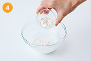 (4)に薄力粉と砂糖を加えて、よく混ぜる。