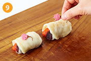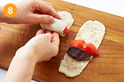 (7)の生地にあんこ・苺をのせて巻く。