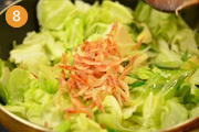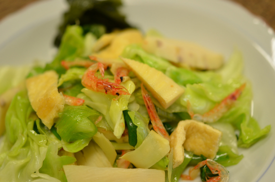 春キャベツはやわらかいので、炒めすぎないように!また、生わかめは、ついている塩を水で流し、水に浸したものを使用ください。