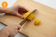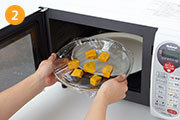 (1)のかぼちゃを耐熱皿に入れラップをかけて500wで約1分30秒加熱する。