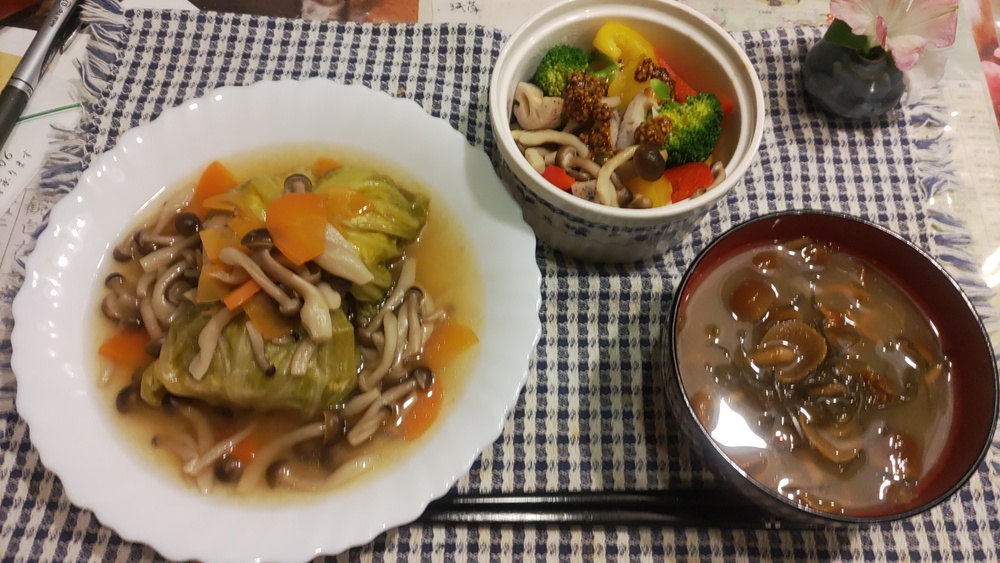 鍋に水を入れ、しめじ、人参、⑥を入れて煮る(10分程)