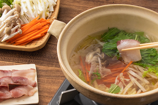 脂ののった寒ブリをあっさりだしでしゃぶしゃぶに。野菜も一緒にたっぷりとれる1品です。