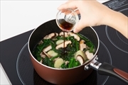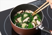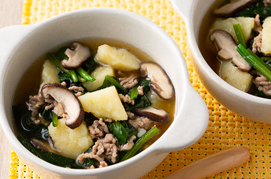 だし汁を鍋で温め②のしいたけと豚ひき肉を加える。ひき肉に火が通ったら②のじゃがいもと③のほうれん草を加える。