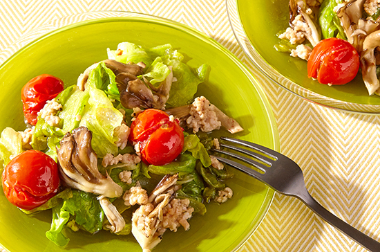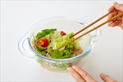 加熱前に鶏ひき肉をしっかり調味料に浸しておくことで、美味しく仕上がります。レタスを一番上にして蒸らすように加熱するのも美味しく火を通すポイントです。ミニトマトは、他の食材と一緒に加熱すると風味が広がりますが、加熱せずに最後に添えてもアクセントになり、見た目が綺麗に仕上がりますので是非お試しください。