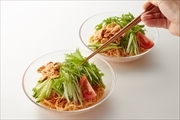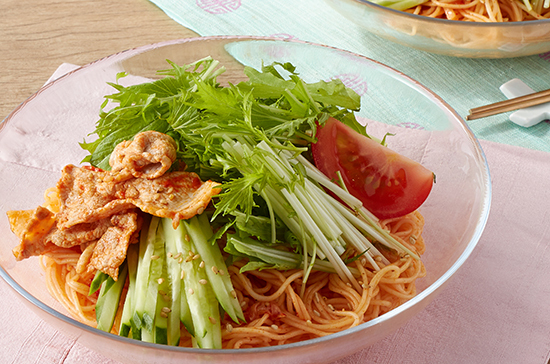 そうめんで作るサラダ風ピビン麺です。たっぷり水菜の食感がよく、満足感のある1品です。