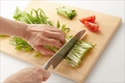 水菜は5cm幅にザク切にする。きゅうりは千切りにする。トマトはくし切りにする。
