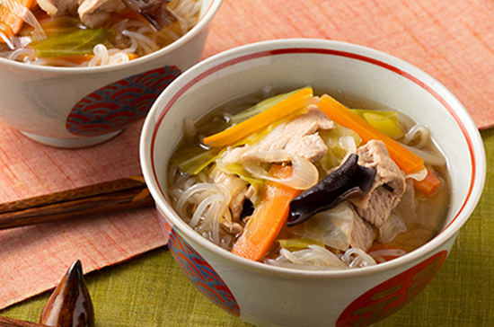 地元の味を知る滋賀医大附属病院の管理栄養士さん直伝。たっぷりの野菜が特徴の近江ちゃんぽんをしらたきで低カロリーにアレンジした一品。麺も伸びないので、時間をかけて、ゆっくり噛んで食べられます。近江ちゃんぽんは、半分くらい食べたらお好みの量のお酢を加えて食べるのが通の食べ方です。スープを残すと塩分が1.2g程度減られます。