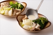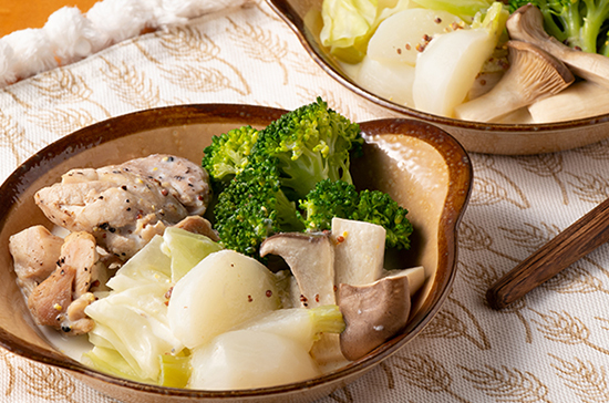クリームソースはカロリーが高めになりがちですが、ソースは生クリームのかわりに牛乳を使い、材料は蒸すことで油を使わずヘルシーに!粒入りマスタードがアクセントになりワンランク上の味に仕上がります。鶏肉からでた汁をソースに加えることでうまみup!