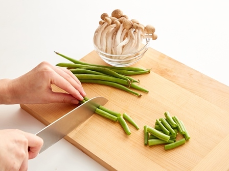 いんげんは4cm幅に切る。しめじは小房に分ける。