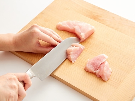 鶏むね肉をそぎ切りにすることによって、味がしみこみやすくなります。