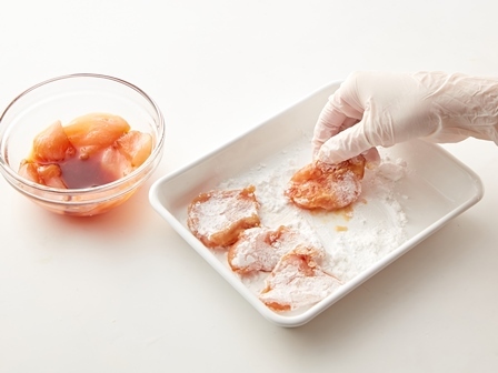 ②の鶏むね肉を調味料Aに15分以上漬け込み、片栗粉をまぶす。