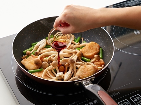 ④にいんげんとしめじを加え、火が通ったらこいくちしょう油、砂糖、みりんを加え炒め合わせる。