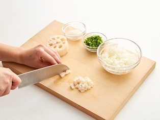 (下準備)れんこんとたまねぎはみじん切り。大根はおろす。青ねぎは小口切りにする。