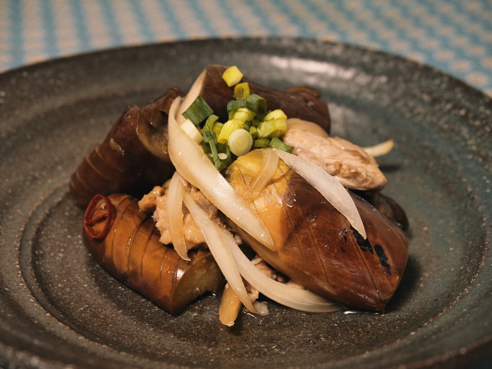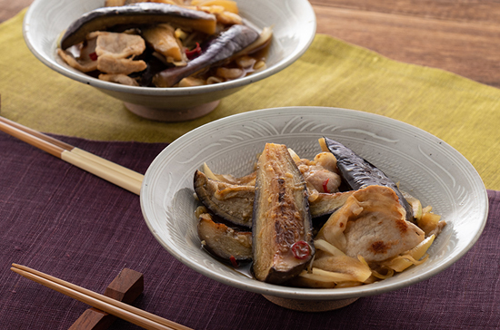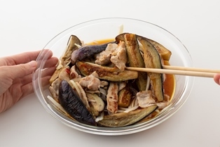調味料を全て合わせ①のたまねぎ、③のなすと豚肉を加えしばらく置いて味をなじませる。