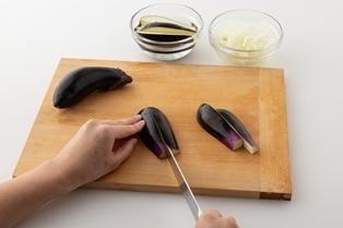 なすを縦に4等分に切り水にさらす。たまねぎをスライスする。