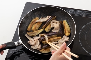 フライパンにごま油を加え熱し、①のなすの水気をきり中火で焼く。ある程度火が通ったら豚肉を加え火が通るまで両面を焼く。