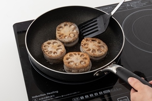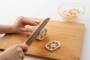 れんこんは皮を剥き5mm幅の輪切りまたは半月切りにして酢水につけておく。