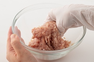 鶏ミンチにこしょうを加え粘りが出るまでよく混ぜる。
